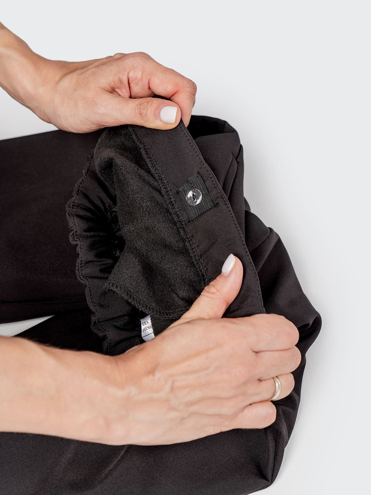 Манжеты с резинкой фиксируют брюки на обуви, защищая от холода.