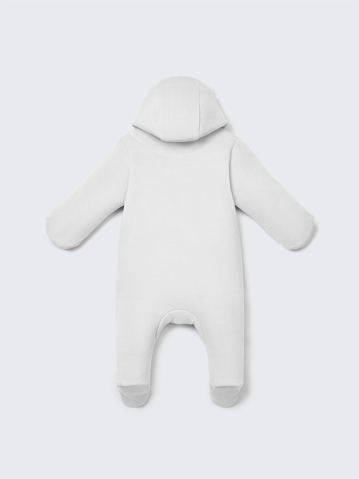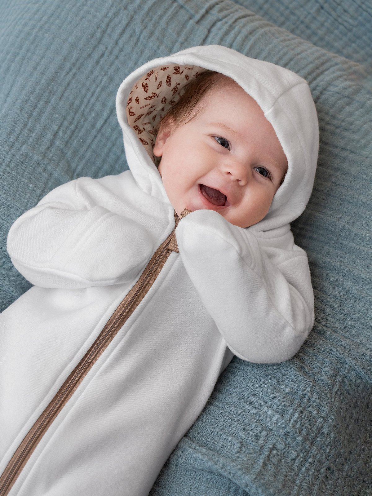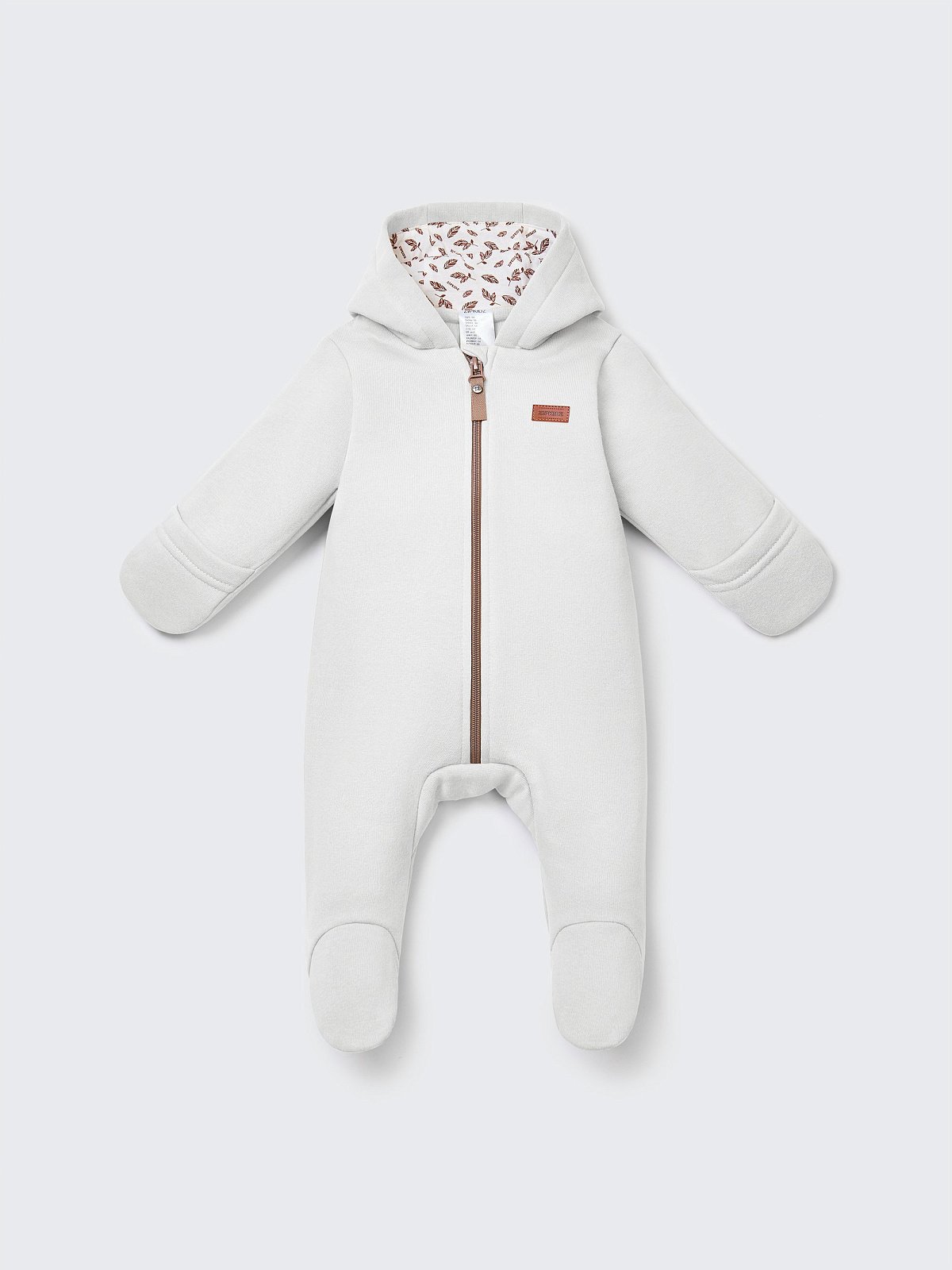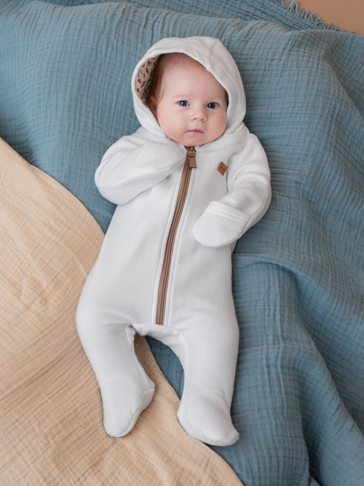 Комбинезон для новорожденных — уютная и практичная одежда для малышей от 1 до 6 месяцев. Изготовлен из мягкого футера с начесом, он сохраняет тепло и обеспечивает комфорт при температуре от +15°C. Закрытые ножки и кармашки-закрывашки на рукавах защищают чувствительную кожу, а капюшон с хлопковой подкладкой защищает голову от ветра.Материал: футер-трикотаж (70% хлопок, 30% эластан), подкладка капюшона — 100% хлопок.