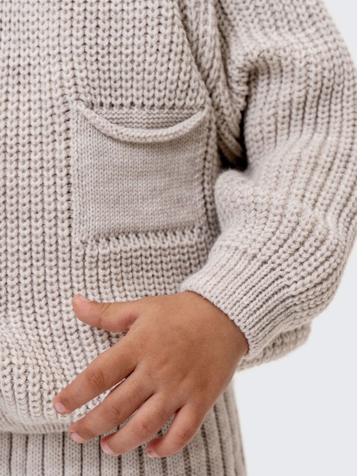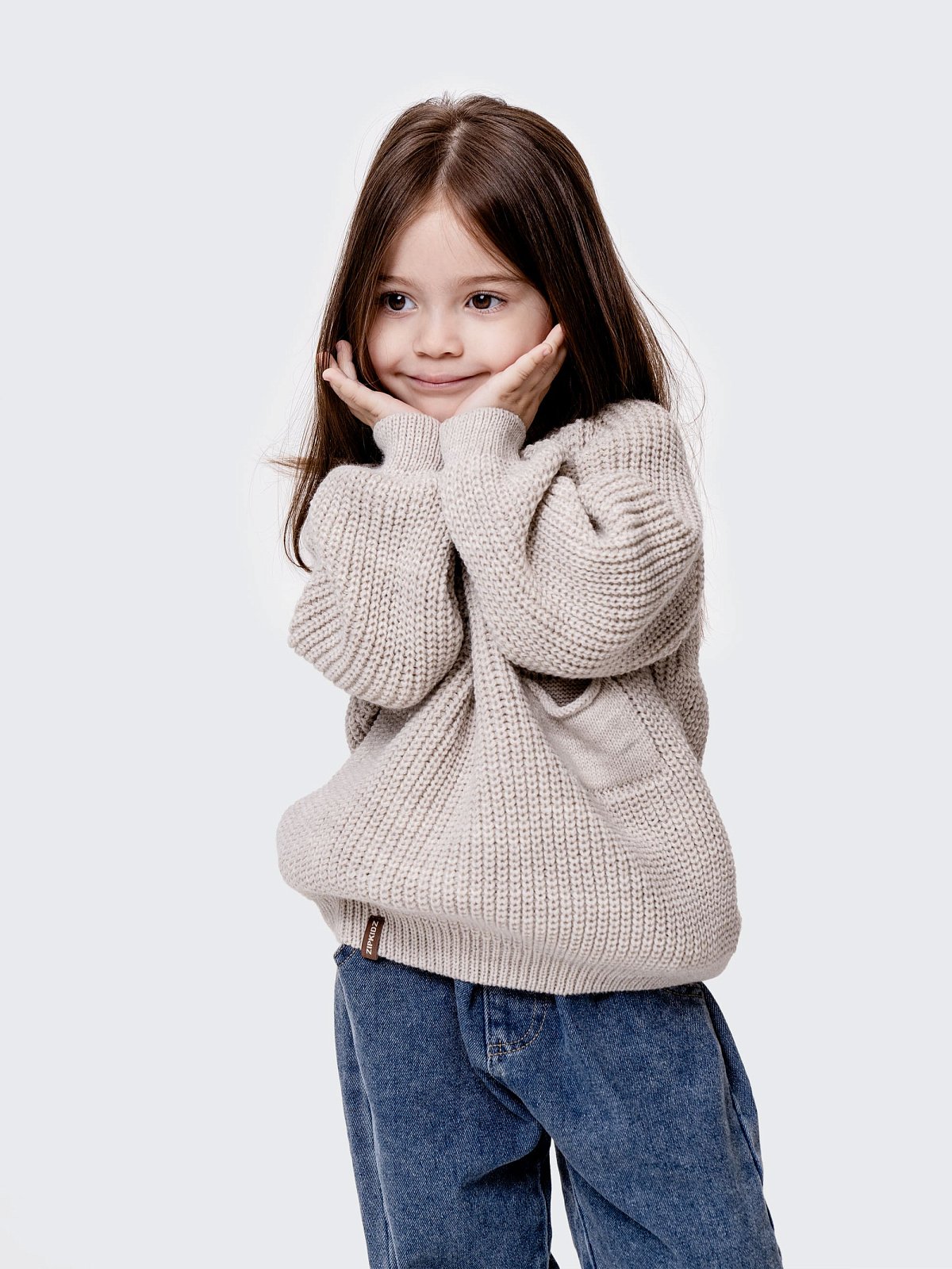Модель представлена в трёх универсальных оттенках: бежевый, молочный и какао — они подойдут как девочкам, так и мальчикам. Фактурная вязка придаёт изделию особый шарм, а свободный крой не сковывает движений, что особенно важно для активных детей.